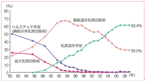 乳がんに対する手術法は、時代とともに変わってきています。1980年頃に主流であったハルステッド手術は全乳房およびその背面にある胸筋(大胸筋および小胸筋)と腋窩リンパ節を一括に切除する侵襲の大きいものでした。この手術を受けられた当時の患者さんにとっては、患側上肢の機能回復が手術後の大きな辛い問題でした。その後に胸筋の切除の有無は患者さんの予後に影響しないことが証明されたため、1990年代には胸筋を切除せずに全乳房および腋窩リンパ節を切除する胸筋温存乳房切除術が一般的な手術になりました。この頃より乳がんの領域に限ってこれを切除して健常な乳房を残す乳房温存手術が年々増えてきて、2003年頃には胸筋温存乳房切除術の数を超え、最近の手術の主流となっています。このように乳がん手術は徐々に縮小化の方向へ進んできました(図1)。