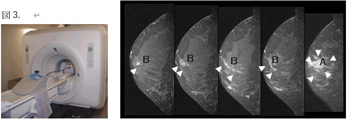 図3. MRI機器(左)と乳がんの造影MRI画像(右)