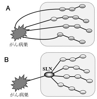 図2. A:がんとリンパ節をつなぐリンパ管が複数ある場合にはどの経路でがん細胞がリンパ節にたどり着くかを推定できない。B:乳房ではリンパ管がほぼ1方向に限定しているため、最初にたどり着くリンパ節は1、2個で、これをセンチネルリンパ節(SLN)と言う。